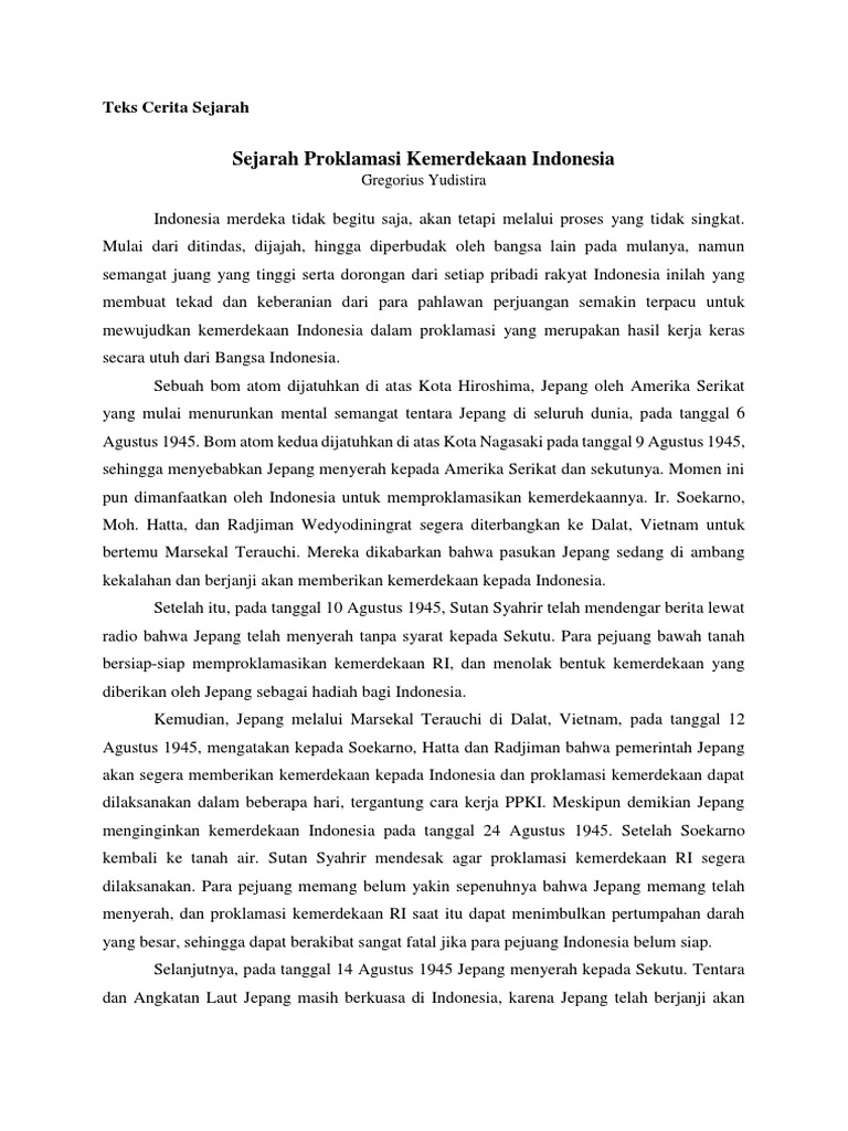 Cerita Sejarah Kemerdekaan Indonesia. Mereka telah sepakat untuk memproklamasikan kemerdekaan bangsa Indonesia hari itu di rumah Soekarno Jalan Pegangsaan Timur No. Namun kamu harus memahami terlebih dahulu apa itu teks cerita sejarah.
