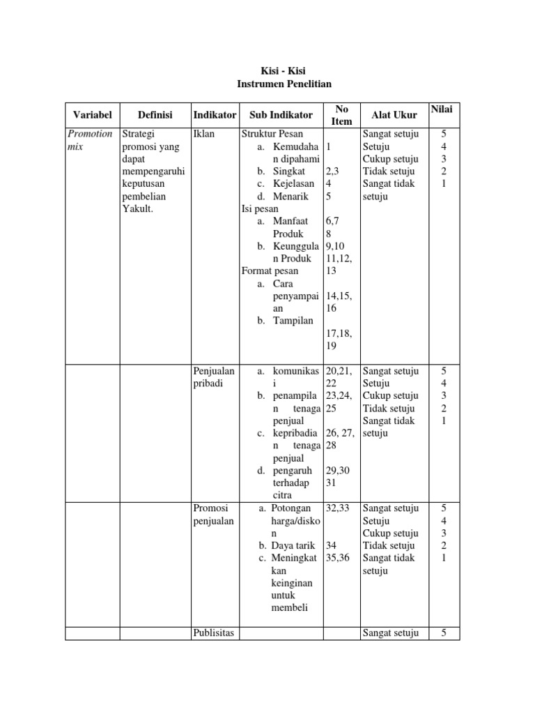 Kisi-kisi Instrumen Kisi-kisi instrumen merupakan pedoman atau panduan dalam merumuskan pertanyaan-pertanyaan instrumen yang diturunkan dari variabel penelitian yang akan diteliti. Apa strategi media Pesan a. Pada dasarnya meneliti adalah melakukan pengukuran terhadap fenomena sosial maupun alam.